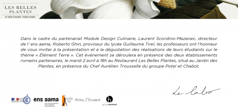 02.April 2019, Paris. Meisterkreis participated in the final event of the project Culinary Design "Elémen'terre" in Paris at the invitation of Laurent Scordino - Manzanec, Director of ENSAAMA, Design School Paris.Innovative and culinary creations were presented together with the hotel school Guillaume Tirel. A good approach also for young German hotel trainees, which we will continue to develop further in partnership with the ENSAAMA.